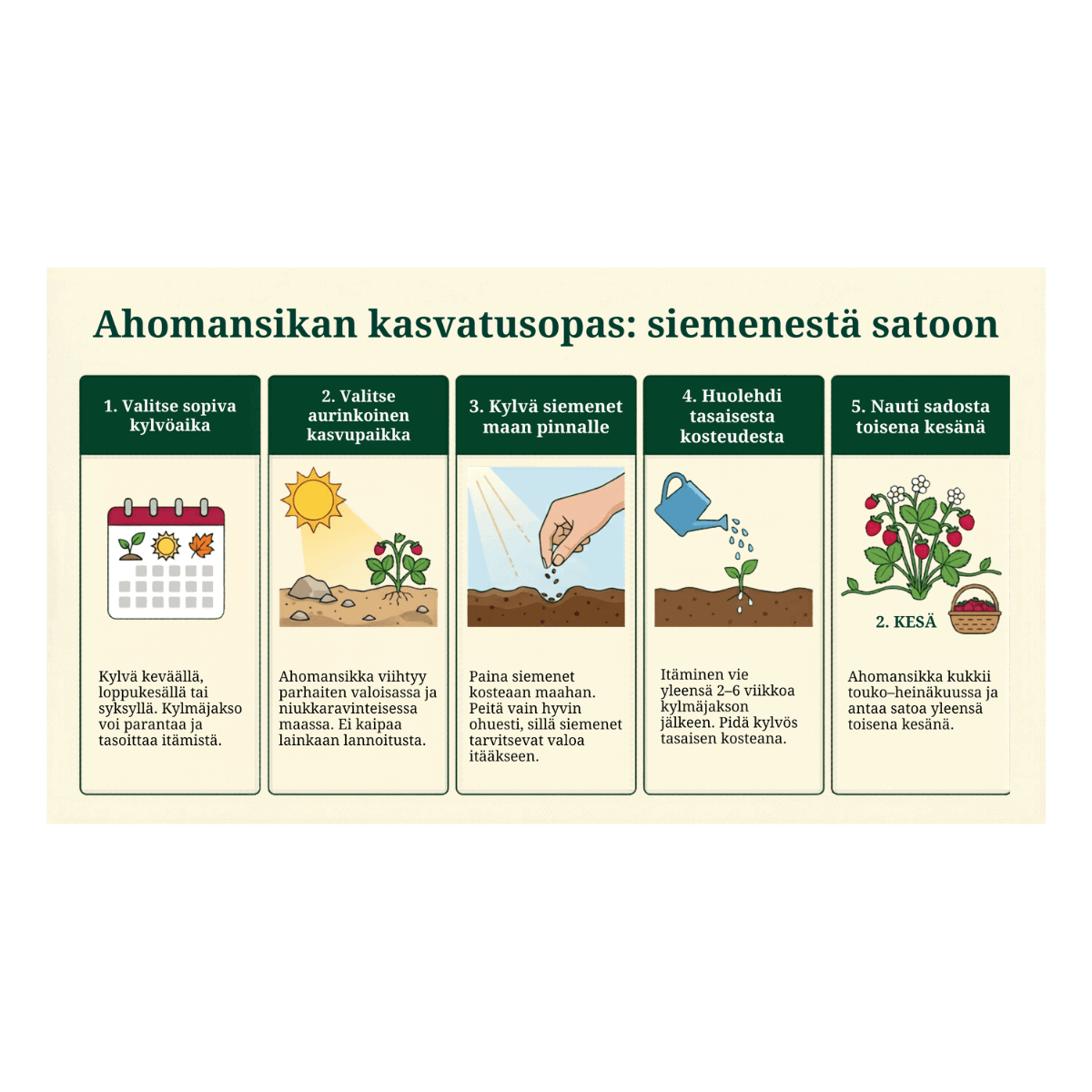 🍓 Ahomansikan marjat ovat syötäviä, herkullisia ja sopivat tuorekäyttöön tai koristeluun. Erinomainen pölyttäjäkasvi myös luonnonmukaisiin pihoihin ja puutarhoihin.